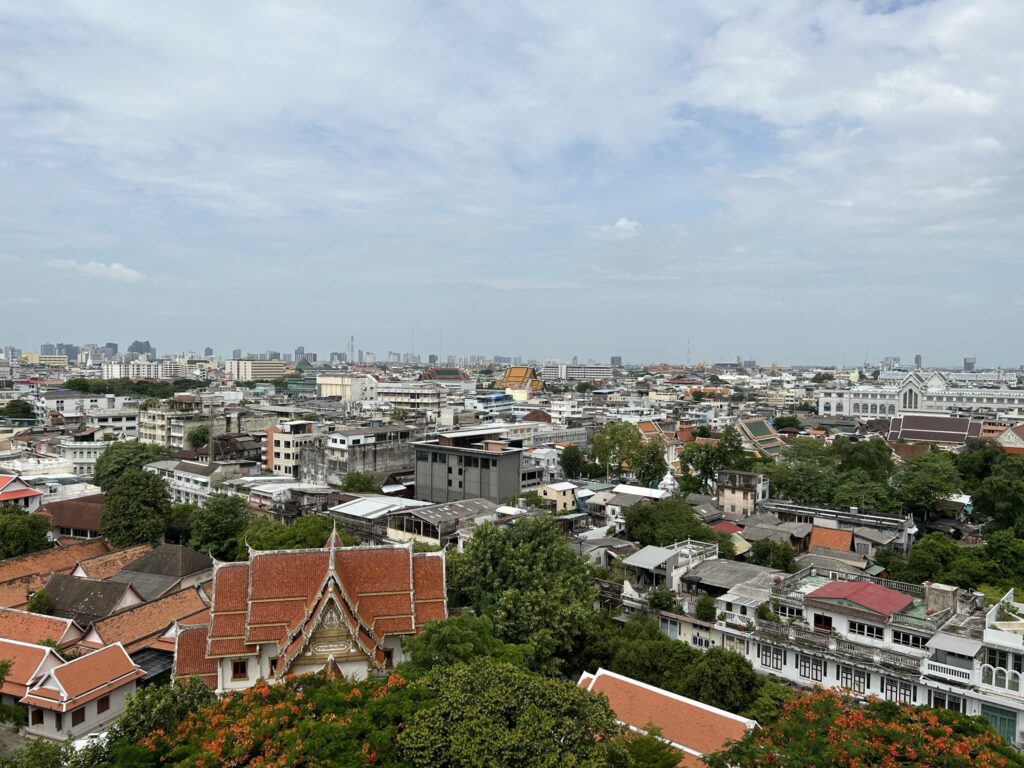 Prima di salutare Bangkok c’è ancora tempo per qualche ultima tappa. Saliamo i 300 gradini del Wat Saket (Golden Mount) tra gong, campane e incenso. Da lassù, il caos di Bangkok quasi scompare e si gode di un panorama a 360 gradi su tutta la città.